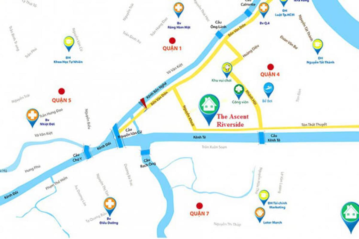 Dự án được xây dựng tại Quận 4, một trong những quận có nhiều trung tâm thương mại, mua sắm sầm uất tại thành phố. Ascent Riverside nằm ngay cạnh dòng sông kênh Tẻ thơ mộng, mang đến một cuộc sống yên bình, thư thái cho cư dân tại đây.