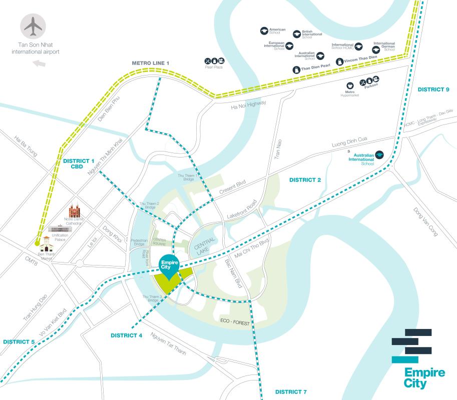 From Empire City Thu Thiem, residents can easily connect to District 1 as well as many neighboring districts such as: District 9, District 7, Binh Thanh District, Thu Duc District,...