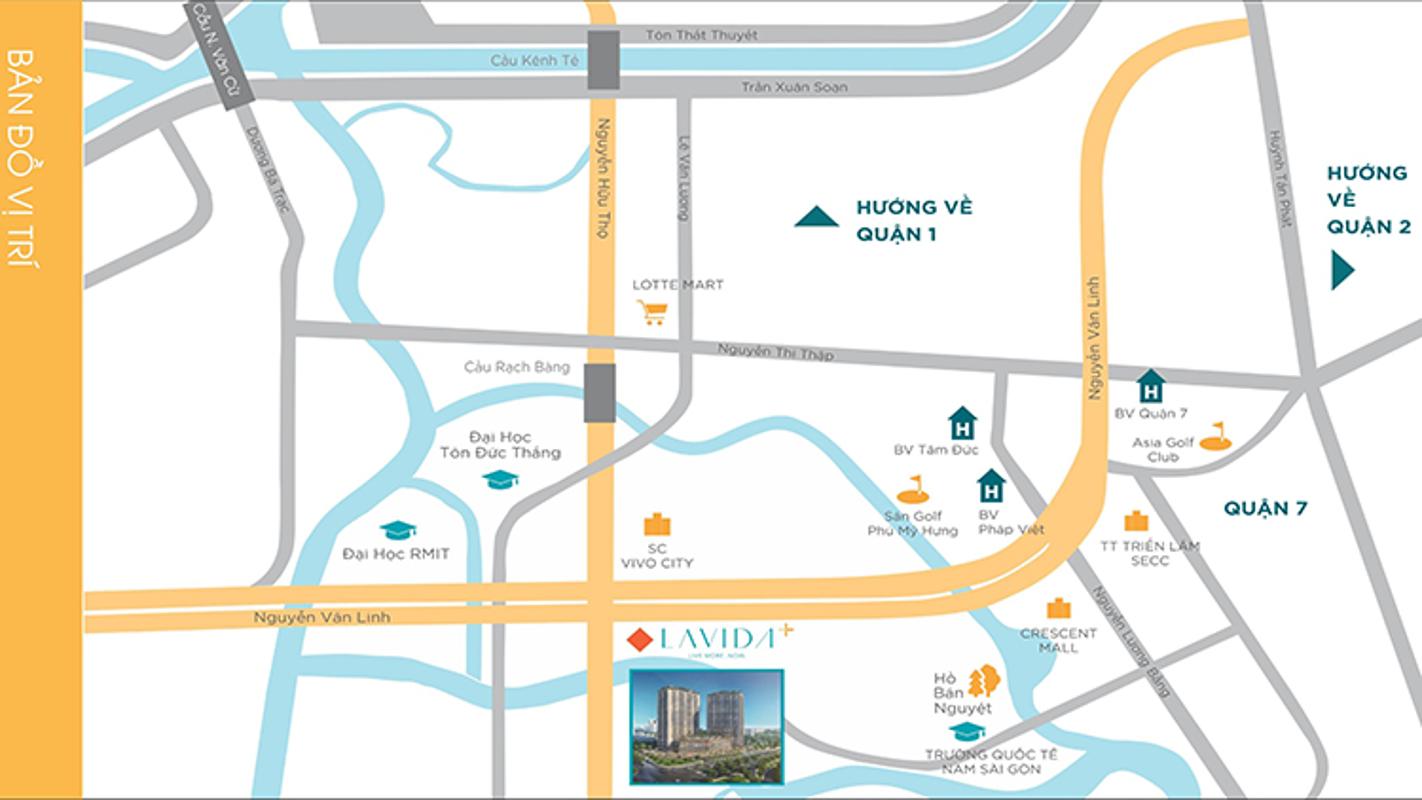 Dự án Lavida Plus quận 7 nằm trên 2 trục đường huyết mạch của Quận 7 là Nguyễn Hữu Thọ và Nguyễn Văn Linh. Đây là 2 con đường trung tâm của hệ thống giao thông trọng điểm, giúp kết nối Quận 7 với hàng loạt các quận huyện khác nhanh chóng, ít kẹt xe vì đường rộng và không ngập úng. Đặc biệt, nằm ngay dọc bờ Đông sông Rạch Đĩa, 3 mặt tiếp giáp trực tiếp với sông nước nên quanh năm mát mẻ.