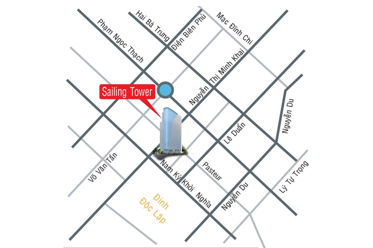 Căn hộ cao cấp Sailing Tower với vị thế nằm ngay trung tâm thành phố Quận 1, cạnh Dinh Thống Nhất và nhà thờ Đức Bà và công viên 30/4 nên thừa hưởng được nhiều bóng mát cây xanh.