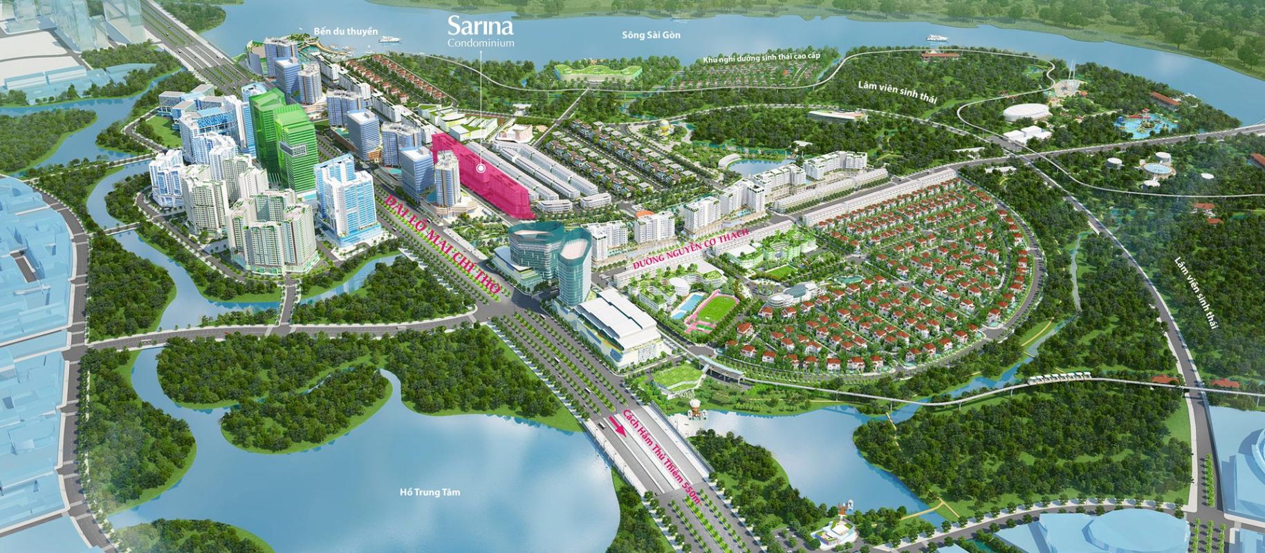 Sarina liên kề trục thương mại, cao ốc văn phòng trên đại lộ Mai Chí Thọ, tiếp giáp với khu nhà phố thương mại Sari Town sầm uất và công viên Sala rộng 5ha. Ngoài ra, Sarina có tầm nhìn toàn cảnh 128 ha Lâm Viên sinh thái và sông Sài Gòn.