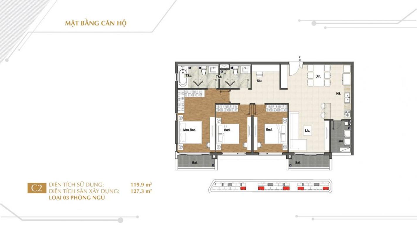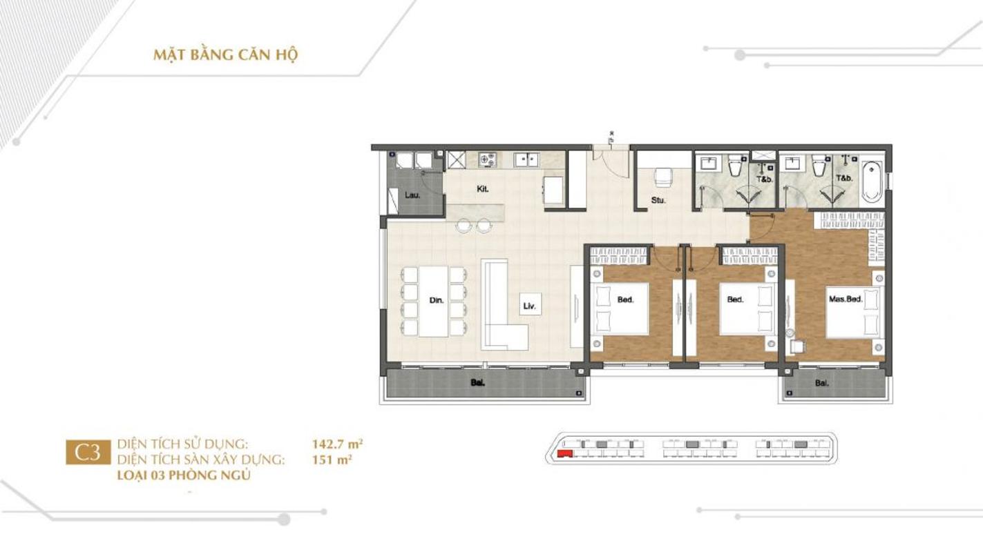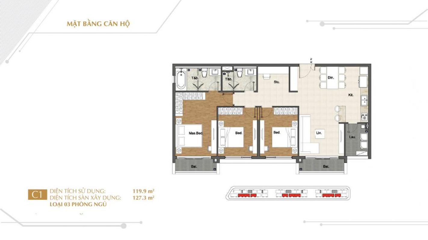 - Diện tích căn hộ 3 phòng ngủ : 118.3 – 145.4 m2