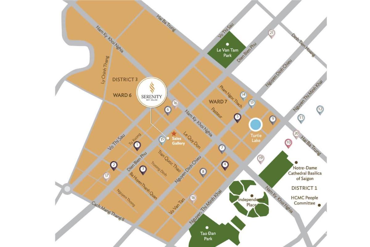 Located in the heart of District 3, adjacent to District 1 - Ho Chi Minh City. Thanks to its unrivaled location, Serenity Sky Villas offers residents the opportunity to experience the finest amenities and services available only in a major urban center, providing an elegant living environment for the affluent that reflects the rhythm of modern life