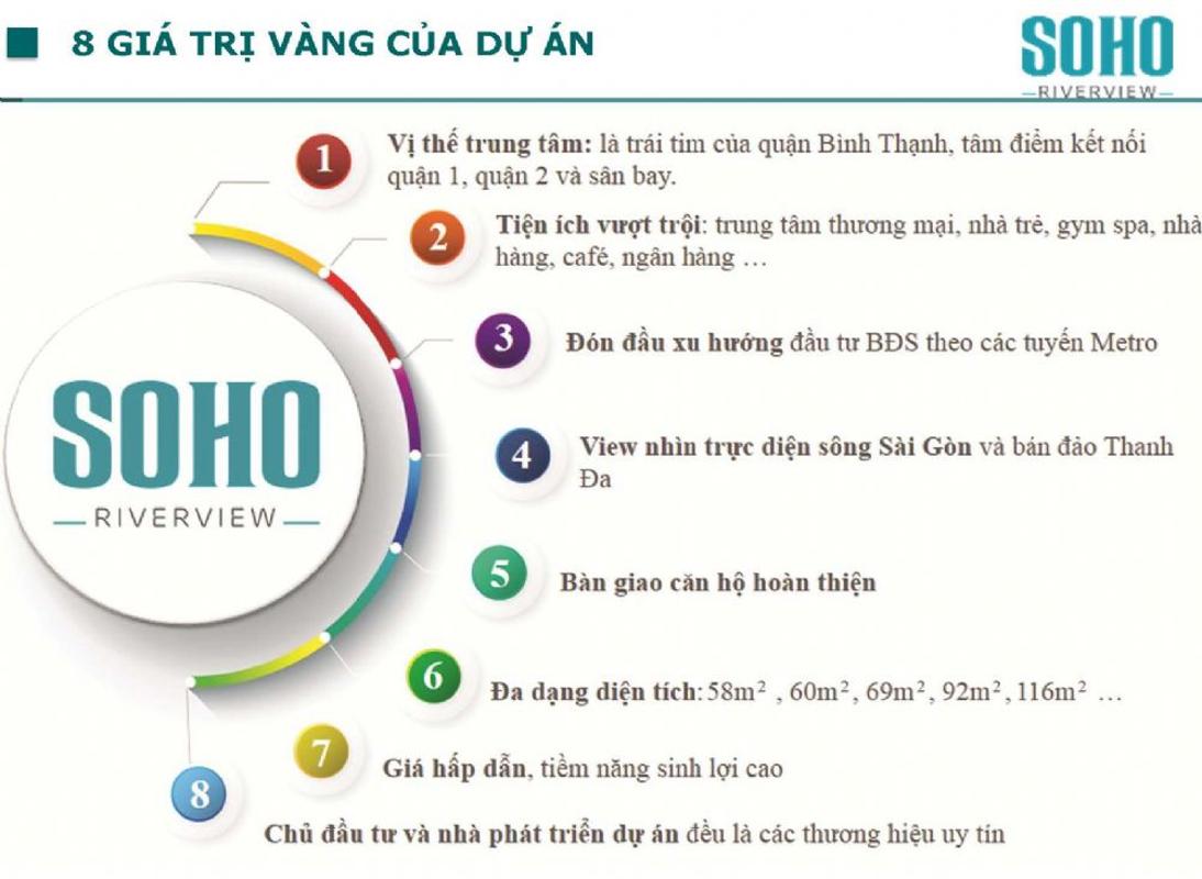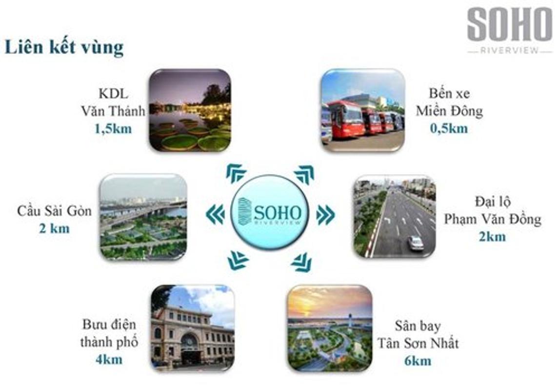 Căn hộ Soho Riverview có lợi thế thừa hưởng được hệ thống tiện ích hạ tầng kinh kế xã hội vô cùng phong phú nơi mà ít căn hộ cao cấp nào có được như: công viên Văn Thánh, khu du lịch Bình Qưới, gần với các siêu thị, bệnh viện.