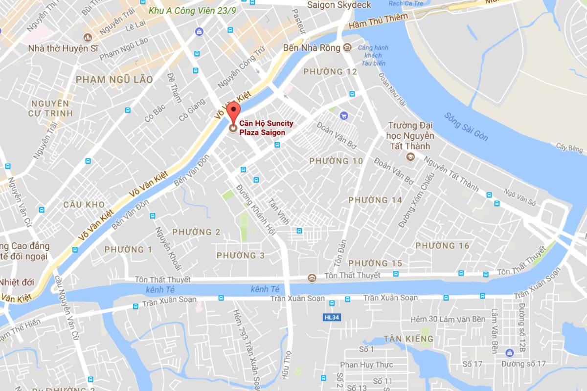 Tọa lạc trên đường Bến Vân Đồn, là điểm kết nối giữa Quận 1 và Quận 4, SunCity Plaza Saigon thừa hưởng tất cả mọi tiện nghi, tiện ích của trung tâm thành phố. SunCity Plaza Saigon được đầu tư cơ sở hạ tầng đồng bộ và hoàn chỉnh với diện tích mặt bằng 7.800 m2 và diện tích xây dựng lên đến 124.000m2 bao gồm 2 tòa nhà cao 32 tầng.
