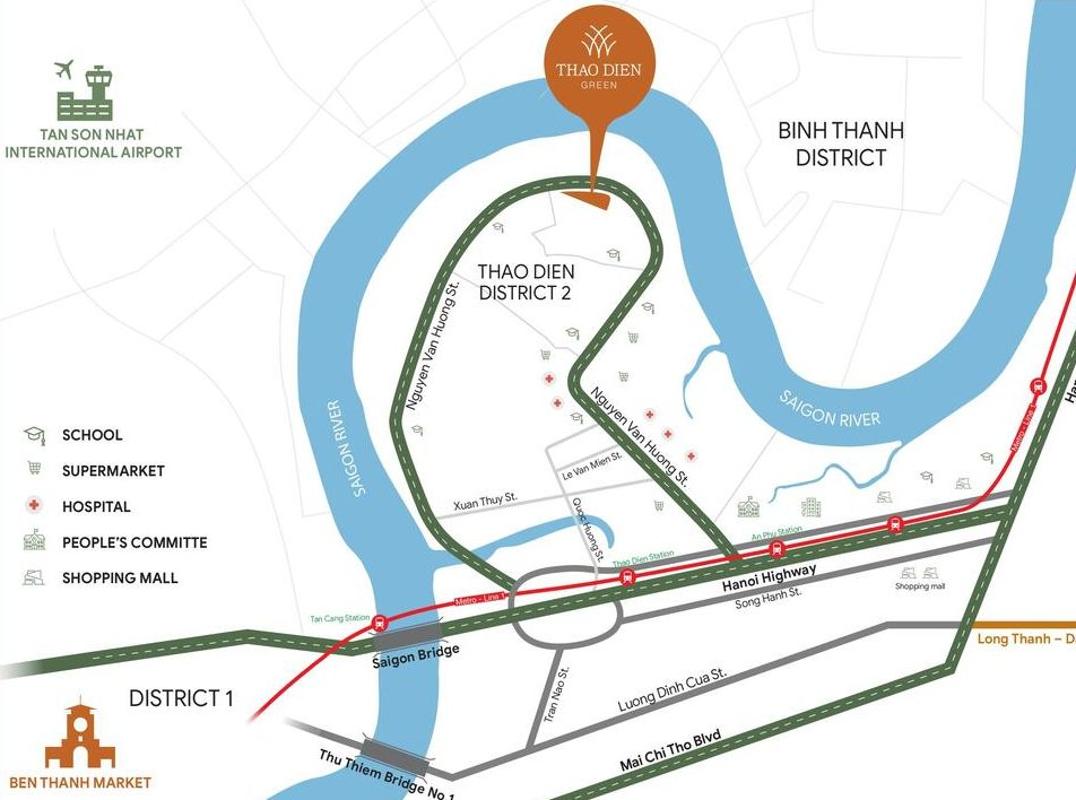 Vị trí dự án tọa lạc ngay trung tâm khu dân cư cao cấp Thảo Điền với 100% căn hộ view sông đẹp mắt. Từ vị trí dự án Thảo Điền Green có thể nhanh chóng kết nối ra Xa lộ Hà Nội, đại lộ Mai Chí Thọ,... và trong tương lai gần là ga metro Bến Thành - Suối Tiên đều thuận tiện.