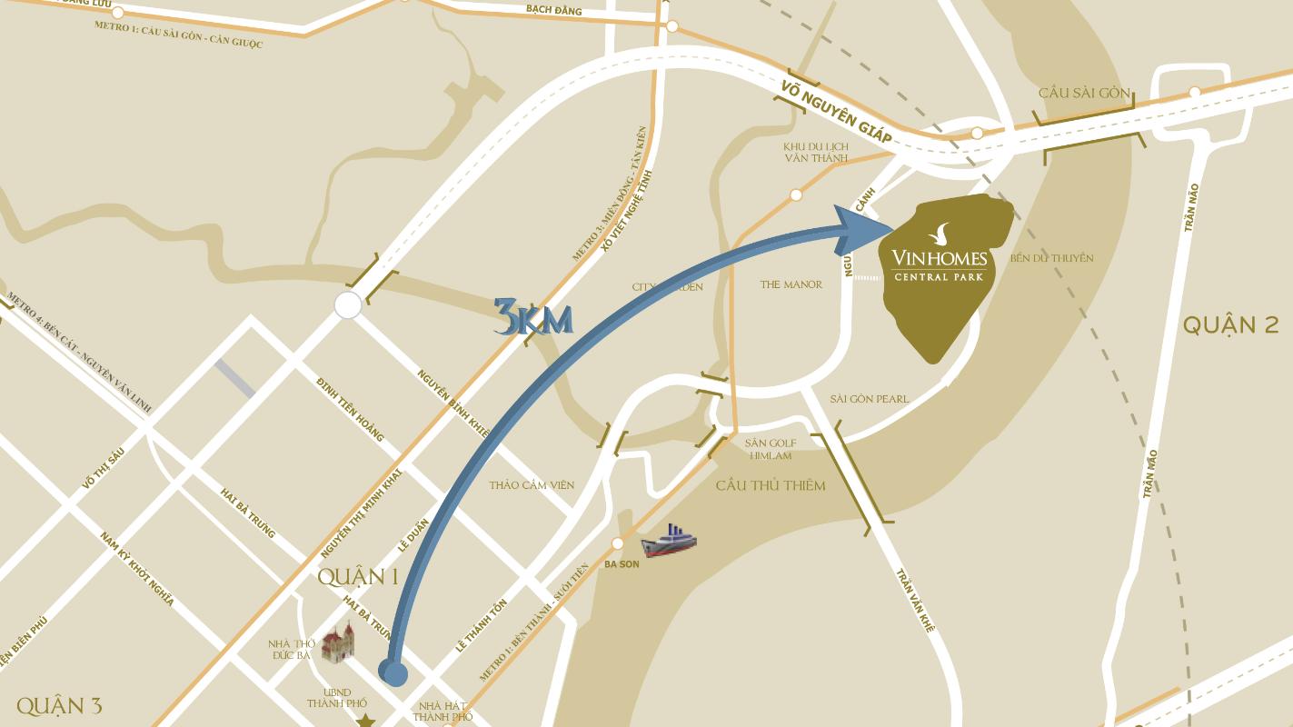 Vinhomes Central Park is situated in the Tân Cảng area, one of Ho Chi Minh City's most coveted locations, with a frontage stretching over 1 km along the Saigon River and serving as one of the stops on the Bến Thành – Suối Tiên metro line. As a result, the project benefits from convenient road, waterway and rail connections. From the apartments, it takes about 2 minutes to Metro Line 1 Bến Thành – Suối Tiên, 3 minutes to the new Thủ Thiêm urban area, 4 minutes to District 1 center,... In addition, Vinhomes Central Park lies on a direct route connecting neighboring districts such as Districts 2, 7, 9, Thủ Đức,... making commuting, work and study convenient for residents.