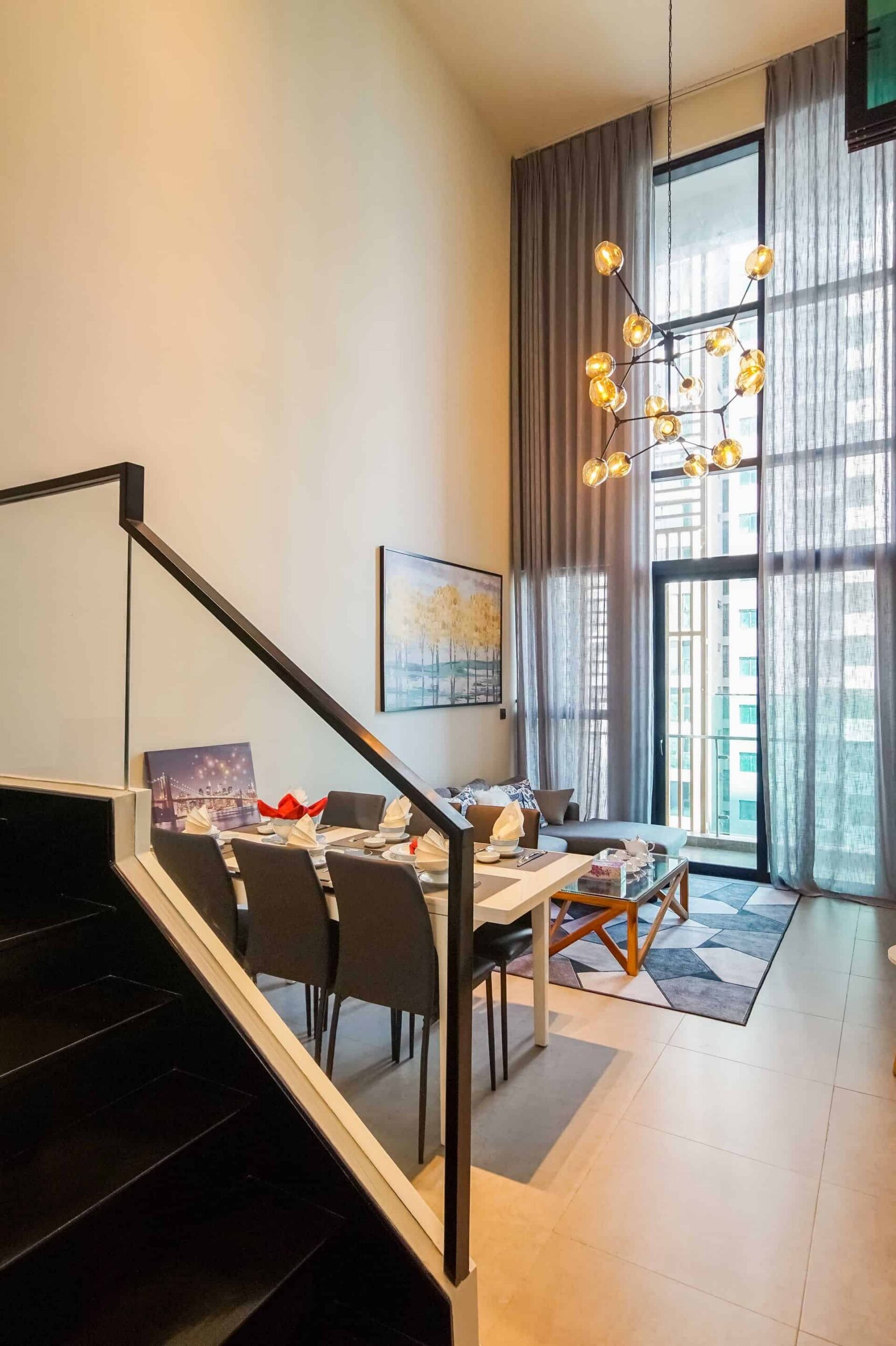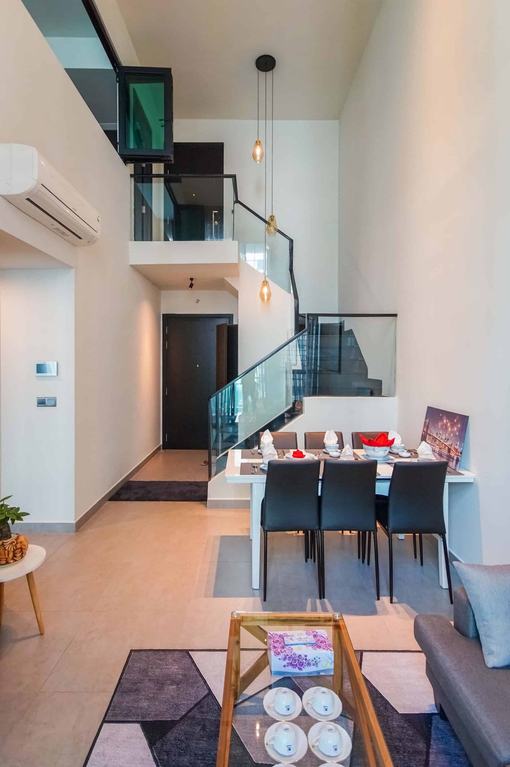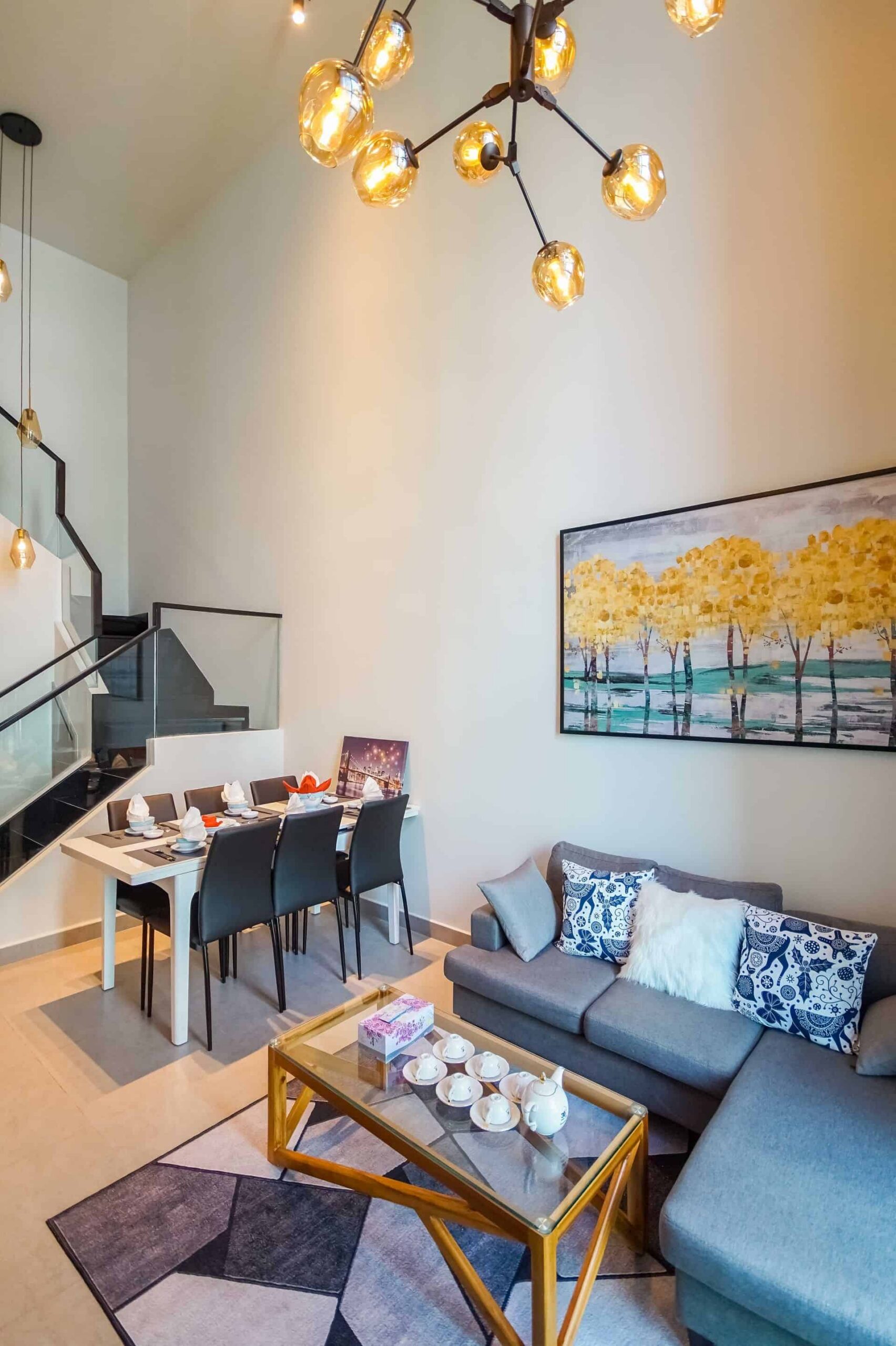 - Nicely decorated living and dining room with feature wall and designer ceiling lights.