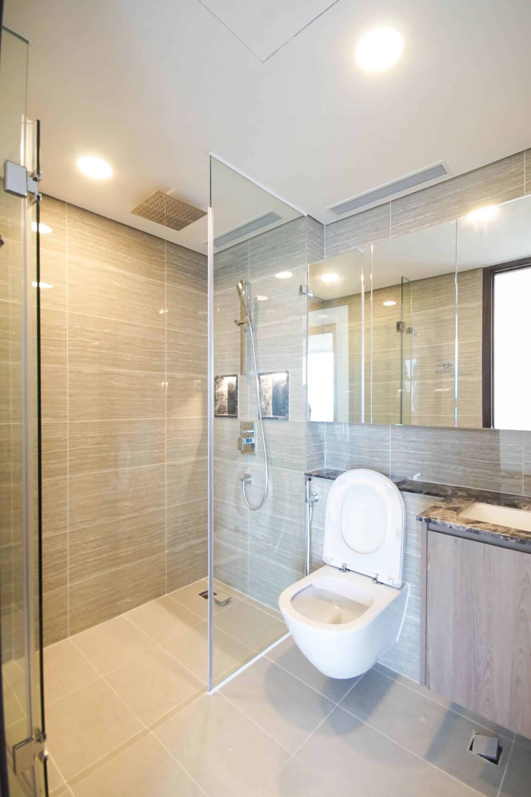 - The guest bathroom also features a tastefully designed rain shower.