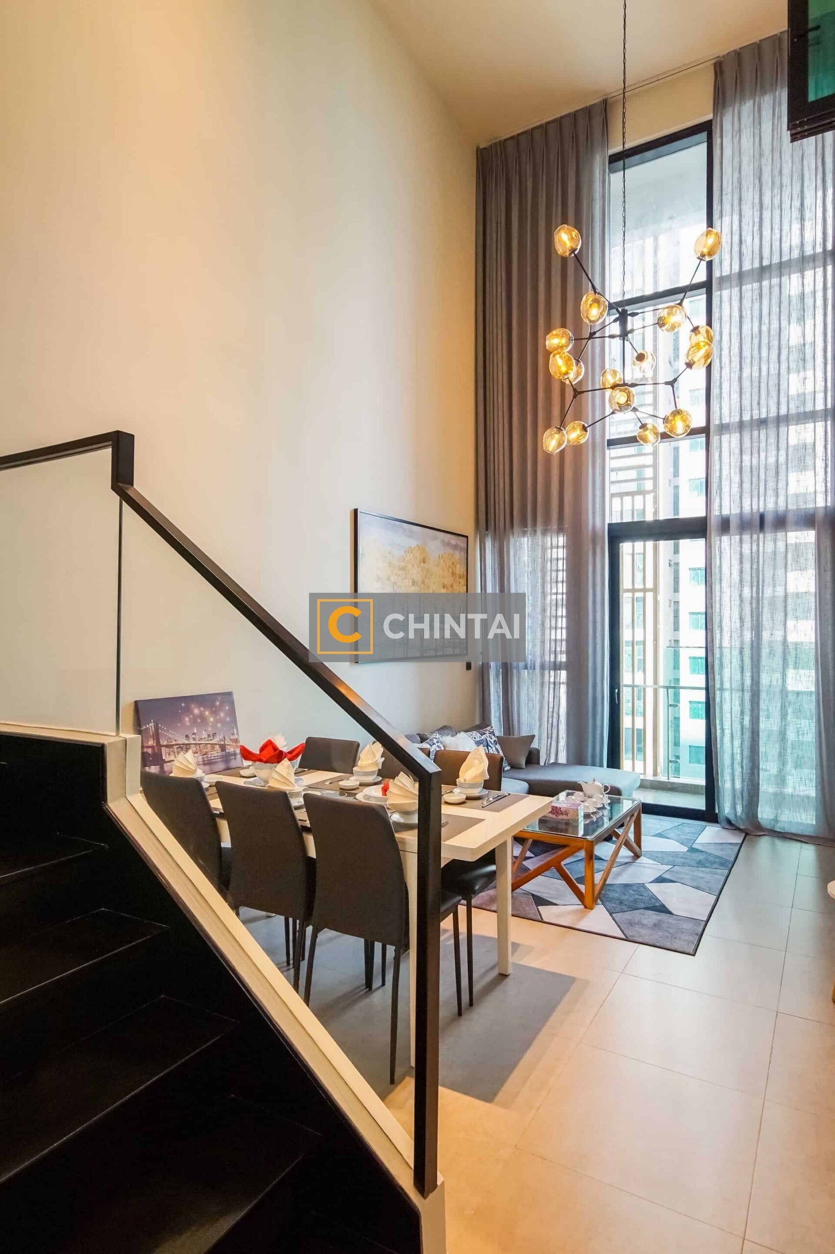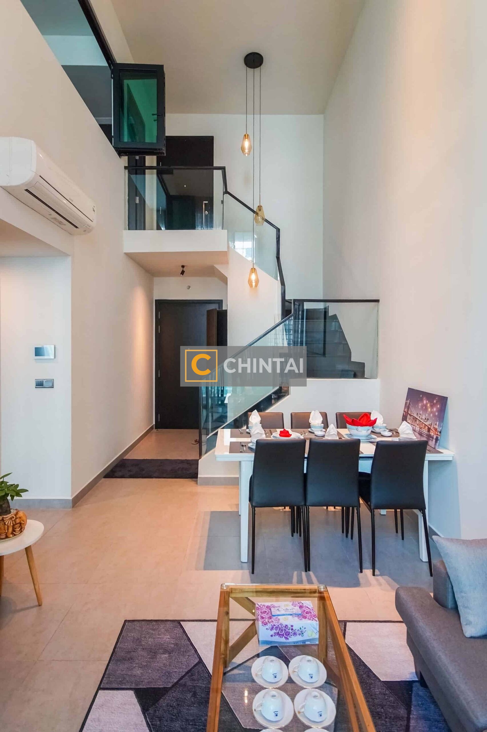 - Nicely decorated living and dining room with feature wall and designer ceiling lights.