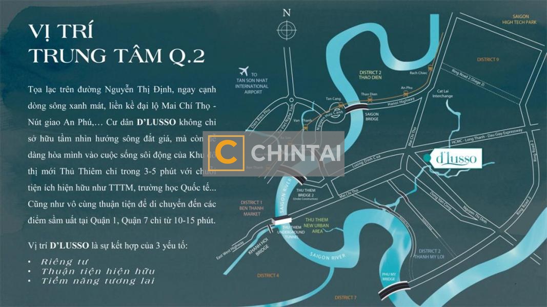 Dự án D’Lusso nằm ngay mặt tiền đường Nguyễn Thị Định, phường An Phú, Quận 2, ven sông Giồng Ông Tố thông thoáng. Vị trí dự án có lợi thế gần với đoạn giao đường Song hành cao tốc TP.HCM – Long Thành – Dầu Giây và cầu Giồng Ông Tố, có thể thuận tiện kết nối với về trung tâm Quận 2, các khu đô thị lớn Quận 2 và Khu Công nghệ cao TP.HCM tại Quận 9.