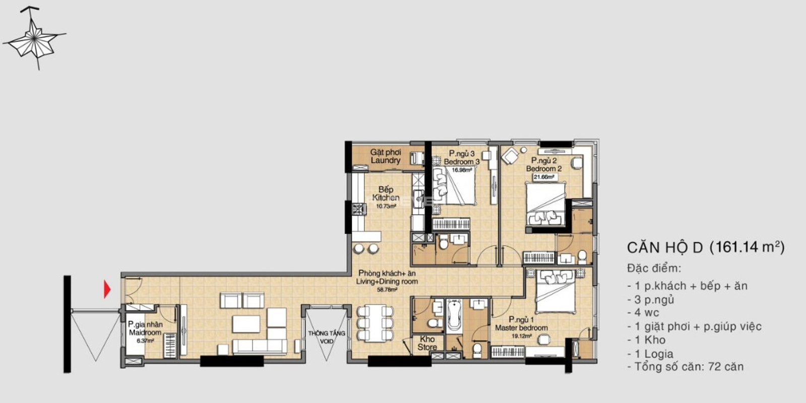Kết cấu: 3 phòng ngủ, 4 phòng tắm