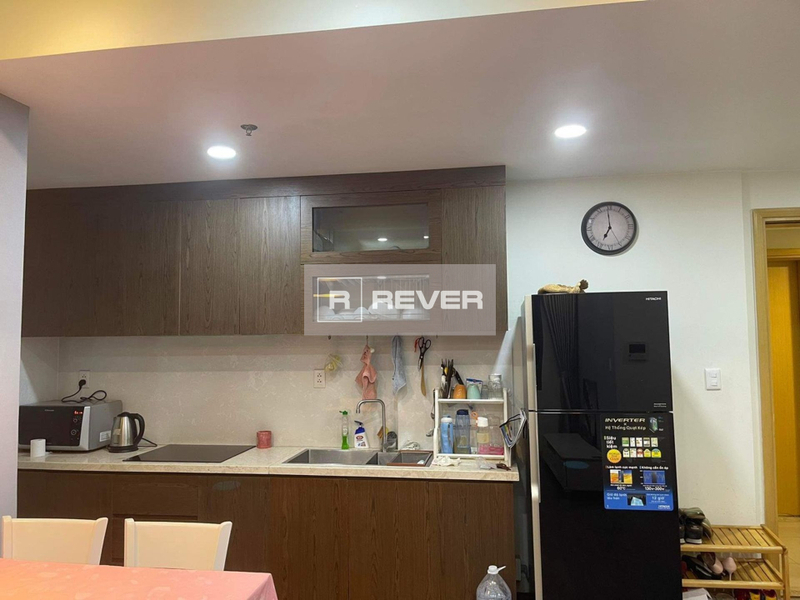 Bộ bàn ăn 4 ghế kiểu dáng gọn gàng được bố trí rất hợp lý gần ngay cửa chính và khu vực bếp. Khu bếp hơi chếch về phía bên trái phòng khách. Hệ thống tủ kệ bếp tích hợp bồn rửa, máy hút mùi và bếp điện từ cao cấp có mặt bàn rộng rãi đủ chỗ để bài trí thêm lò vi sóng Sharp, cùng tủ lạnh Samsung được đặt sát tường gọn gàng, tạo nên một không gian khá thông thoáng với lối đi rộng rãi.
