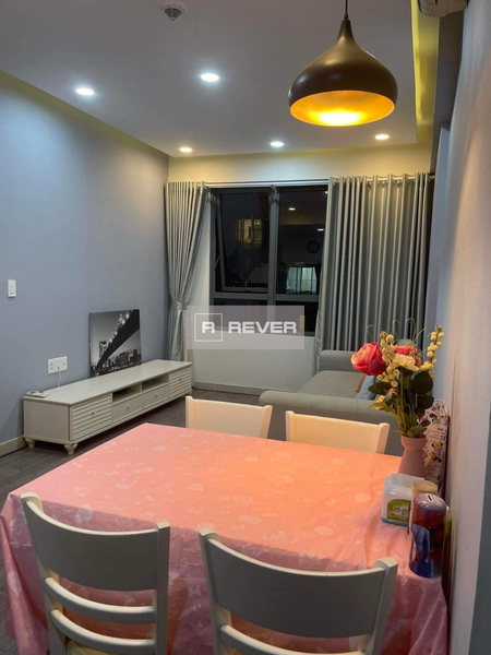 Phòng khách nổi bật trong phong cách hiện đại với ghế sofa dài màu xám, bàn sofa cách tân được sơn trắng và nằm gọn gàng trên tấm thảm lông lớn. Kệ TV dài đơn giản với chân đế kim loại sơn đen và phần khung làm bằng gỗ công nghiệp có màu sắc tự nhiên khá tinh tế, vừa tiện dụng lại không chiếm dụng nhiều diện tích. Từ phòng khách, bạn có thể bước ra ban công có diện tích vừa đủ để hóng mát và nhìn ngắm cảnh quan thơ mộng với rừng cây xanh, những căn villa sang trọng, sông Sài Gòn và phía xa là bán đảo Thanh Đa.