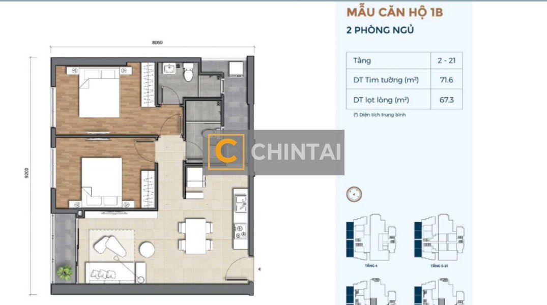 - Kết cấu: 2 phòng ngủ và 2 phòng tắm.