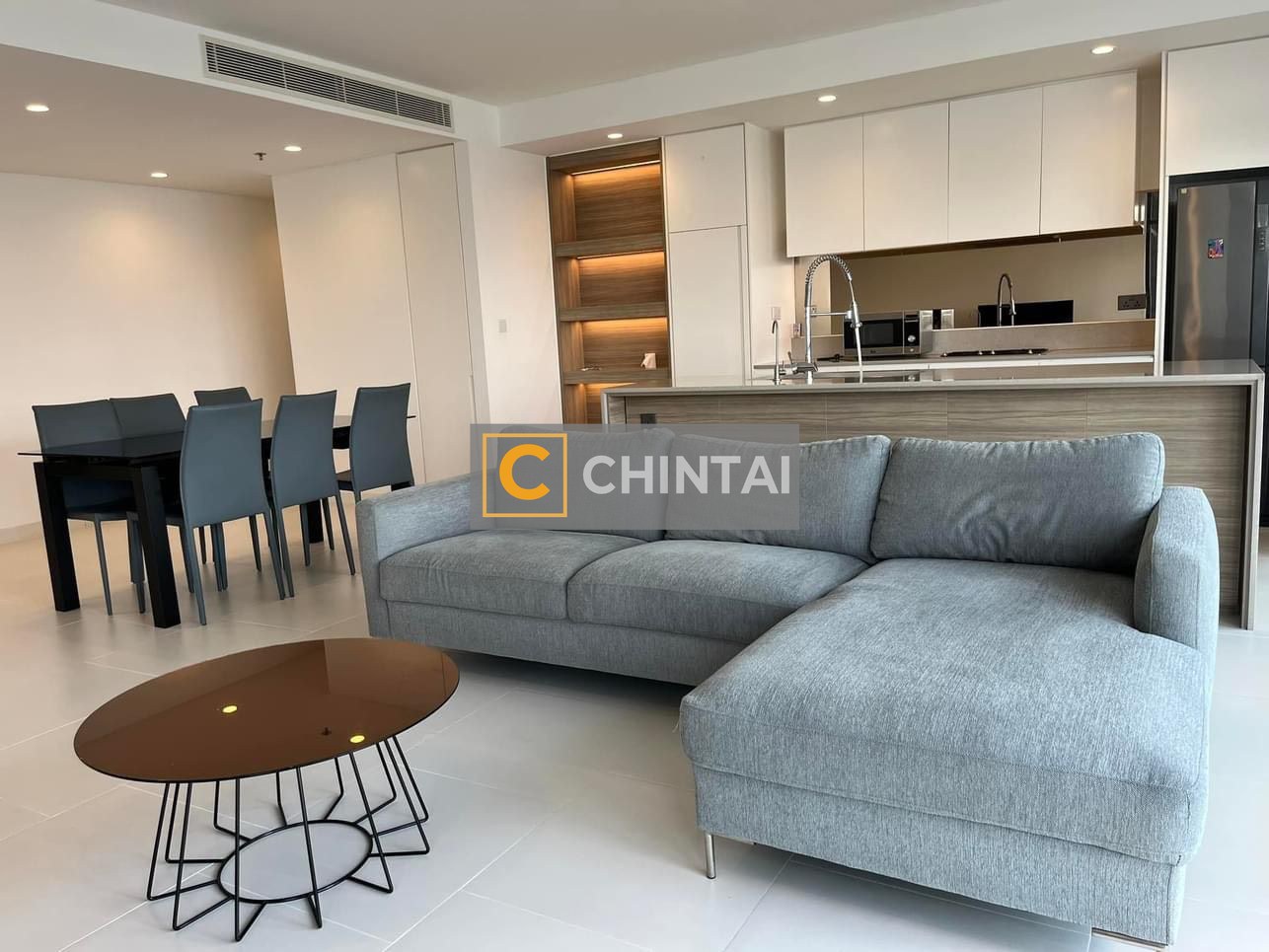 This spacious 3-bedroom apartment, spanning 145 sqm in the City Garden complex in Ho Chi Minh City, epitomizes modern urban living with its thoughtful design and panoramic views. As you enter, you're greeted by a generous living space that seamlessly integrates a comfortable lounge area, a dining zone, and a state-of-the-art kitchen. The living room is furnished with a chic, grey sectional sofa that offers ample seating, complemented by a stylish round coffee table and a sleek entertainment unit. The dining area is set with a contemporary black table and matching chairs, perfect for hosting dinners or enjoying everyday meals. Overlooking this space is the kitchen, equipped with modern appliances, white overhead cabinets, and under-cabinet lighting that casts a warm glow on the wooden lower cabinets and polished countertop. Floor-to-ceiling windows encase the living area, framing the dynamic cityscape and drawing in natural light that illuminates the pristine, tiled flooring. These expansive windows not only enhance the sense of space but also connect the indoors with the bustling city life outside. Each bedroom is a serene retreat with hardwood flooring that contrasts with the light walls, creating a cozy and inviting atmosphere. The master bedroom boasts a large, plush bed with a stylish headboard, flanked by minimalist nightstands. The room's wide window offers a private view of the skyline, a delightful scene to wake up to. The apartment's vantage point on a high floor allows for breathtaking views of Ho Chi Minh City's skyline, with urban vistas that stretch out to the river, providing a stunning backdrop to this luxurious living space. Designed for discerning tenants who seek a blend of comfort, style, and convenience, this apartment is not just a place to live but a statement of a modern, cosmopolitan lifestyle in one of the city's most prestigious developments.