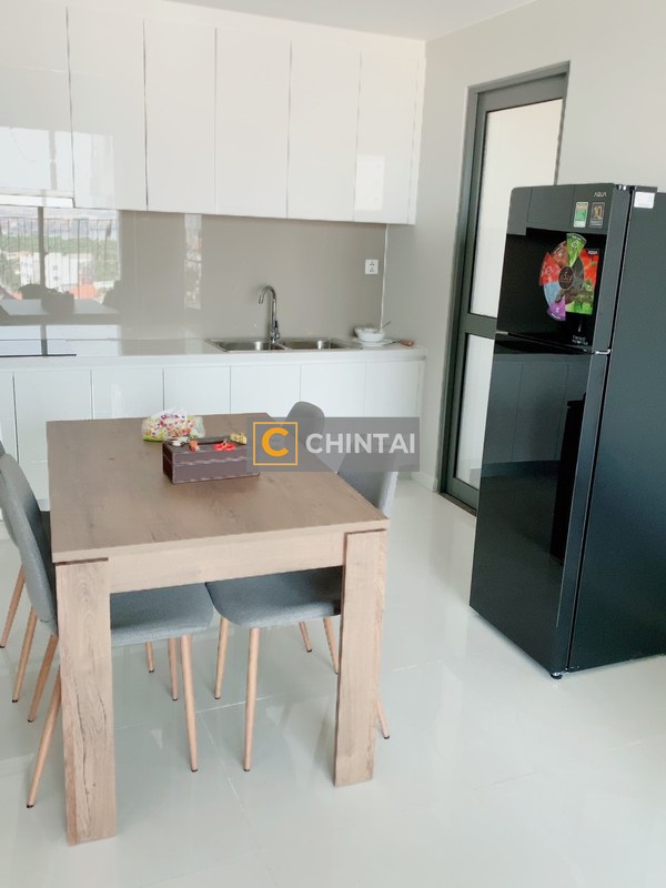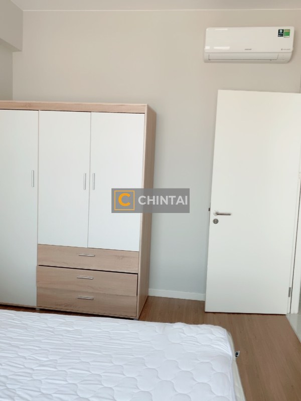 The Masteri An Phú apartment features a modern design and open space, focusing on family convenience. The living room has a wide glass sliding door leading to the balcony, combined with windows in other rooms to ensure good air circulation. The white kitchen cabinets are long and wall-mounted near the loggia, with a white ceramic stone countertop and tempered glass backsplash that is scratch-resistant and easy to clean. The bedroom is simply furnished with wooden flooring, bed, and wardrobe. The apartment is fully furnished, ready for immediate move-in.