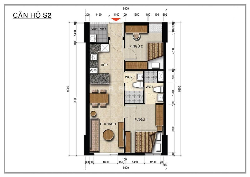 Kết cấu: 2 phòng ngủ, 2 phòng tắm